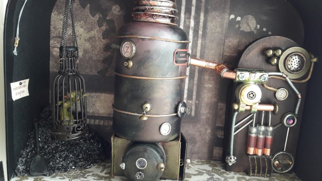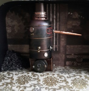 Assistant’s note: I am pleased to report that Henry’s departure was successful – although I do rather miss him. By some strange space-time anomaly, a lifeless but otherwise perfect version of Henry, as he looked when he first arrived in my cottage, has remained behind and is offered for sale at the Steampunk Dolls’ House (click for link). The engine room will also be offered for sale, either at the shop or on my Steampunk – Shrunk! stall at the Glastonbury Craft and Vintage Fairs held once a month. Contact me for details.