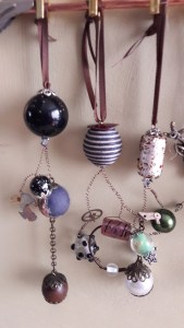 Idly I began twisting wire around needles to form coils and threading them with whatever came to hand – vintage beads from an old necklace, cog wheels and watch parts, bells, charms and even miniature teapots.