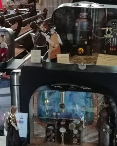 Upon our return to Steampunk Towers (and mainly, I suspect, to quieten the complaints about the journey from Lady Christabel) Mrs Steampunkle announced that some of us would be heading to a new residence. I was fortunate enough to be chosen, along with Lady Christabel, Sir William and the lovely Miss Delilah, to inhabit a glass display cabinet at a quite charming Emporium in the Somerset town of Street. We have five of my friend Mr Robottom’s robots with us, as well as several cabinets of curiosities and the Looking Glass rooms Mrs Steampunkle quite recently completed.