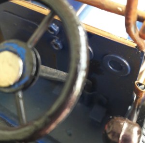 The dashboard (two metal washers, two tiny bolts and a strip of tin) was replaced by an array of dials, ‘lights’ and switches, a clock with cogs and a deep blue leather map pocket, complete with removable map.  The scrap jewellery box was raided to create headlamps (a pair of pearl earrings painted over with more nail varnish) and fog lamps.  My signature copper tape (sold as slug repellent) trimmed the details and was used to fix the clear acrylic windscreen in place.   No automatic alt text available.Tobias declared himself satisfied with the result and, pulling down his goggles, climbed back into the driving seat for a photo-shoot.